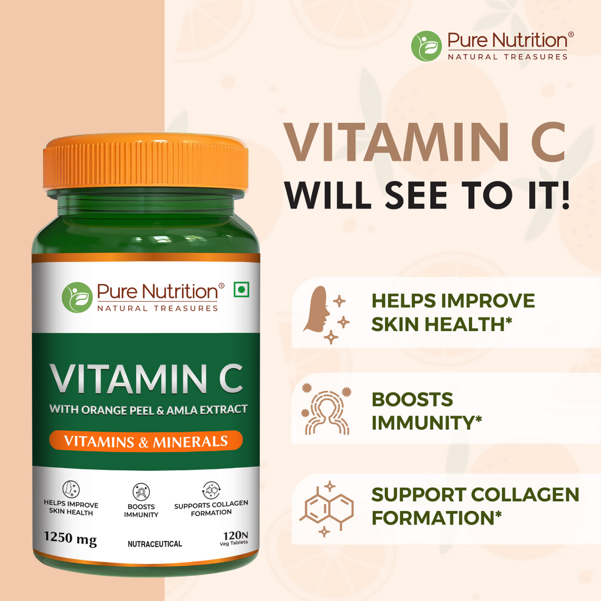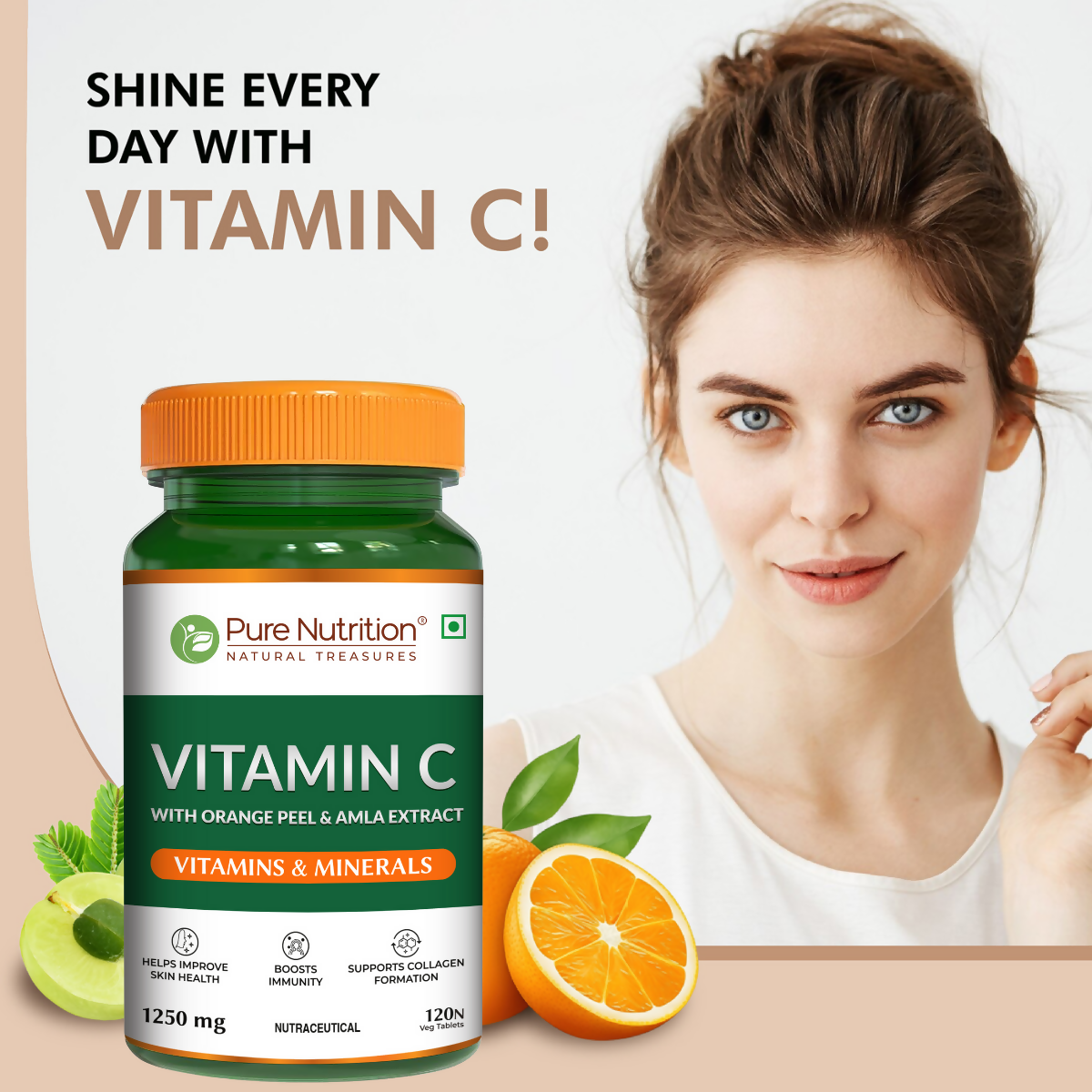 Pure Nutrition Plant-Based Vitamin C (1250mg) - 120 Veg Tablets with Amla & Orange Peel Extract | Boosts Immunity & Skin Glow | Natural Antioxidant for Men & Women | Supports Collagen Formation