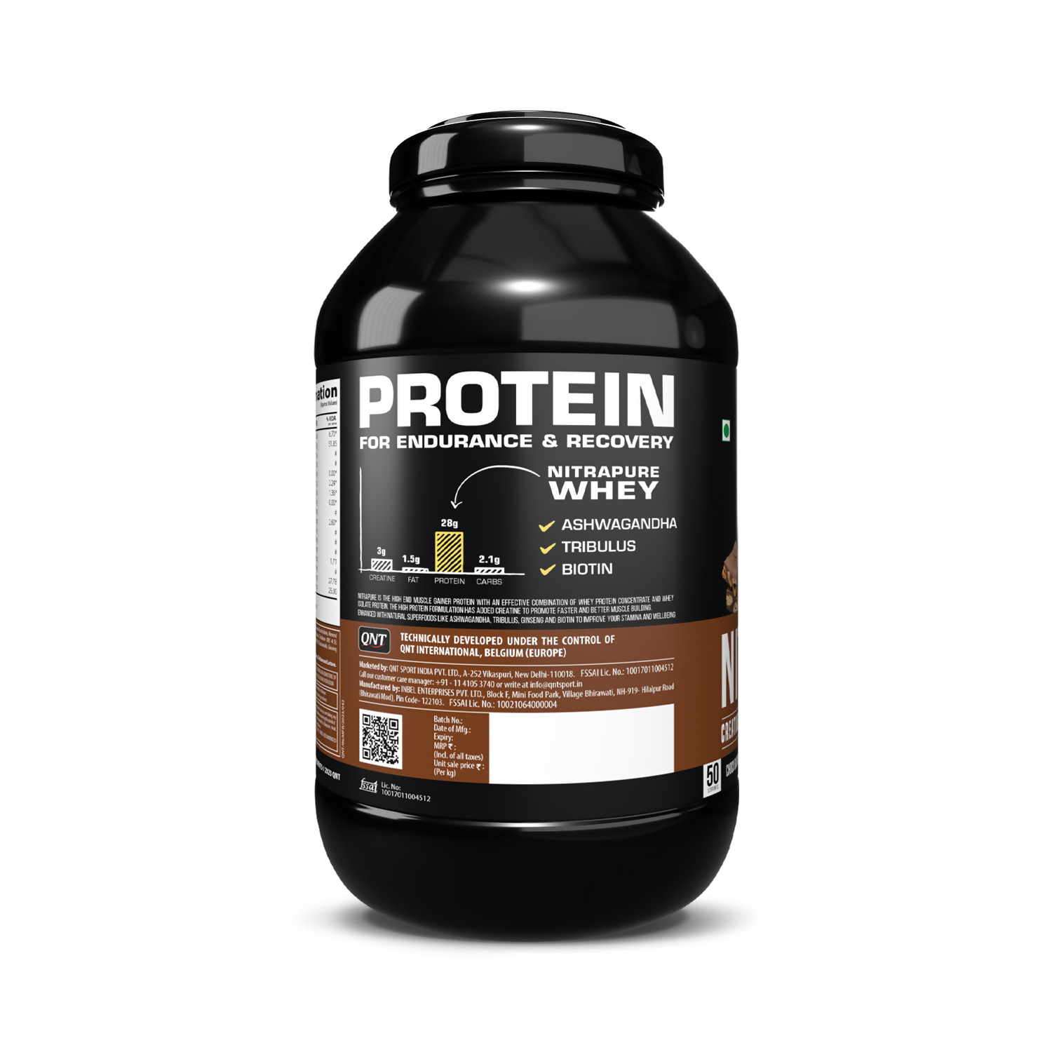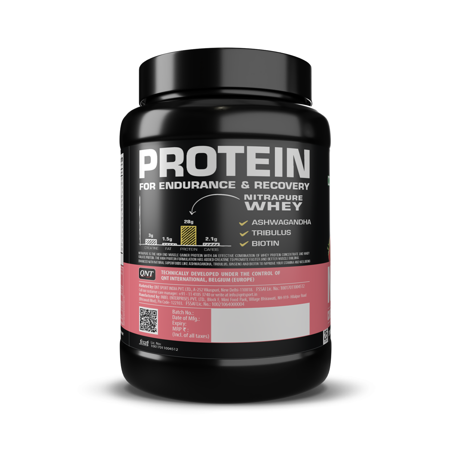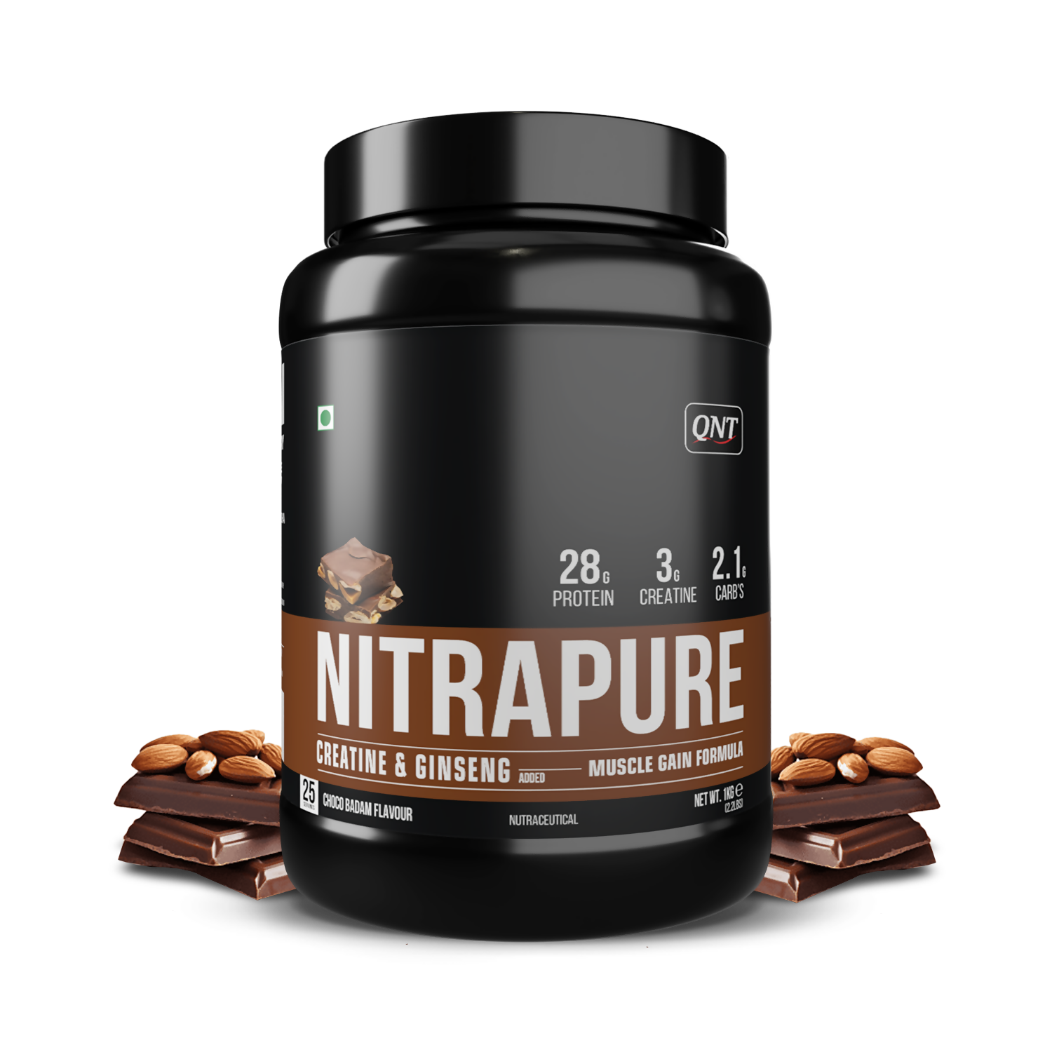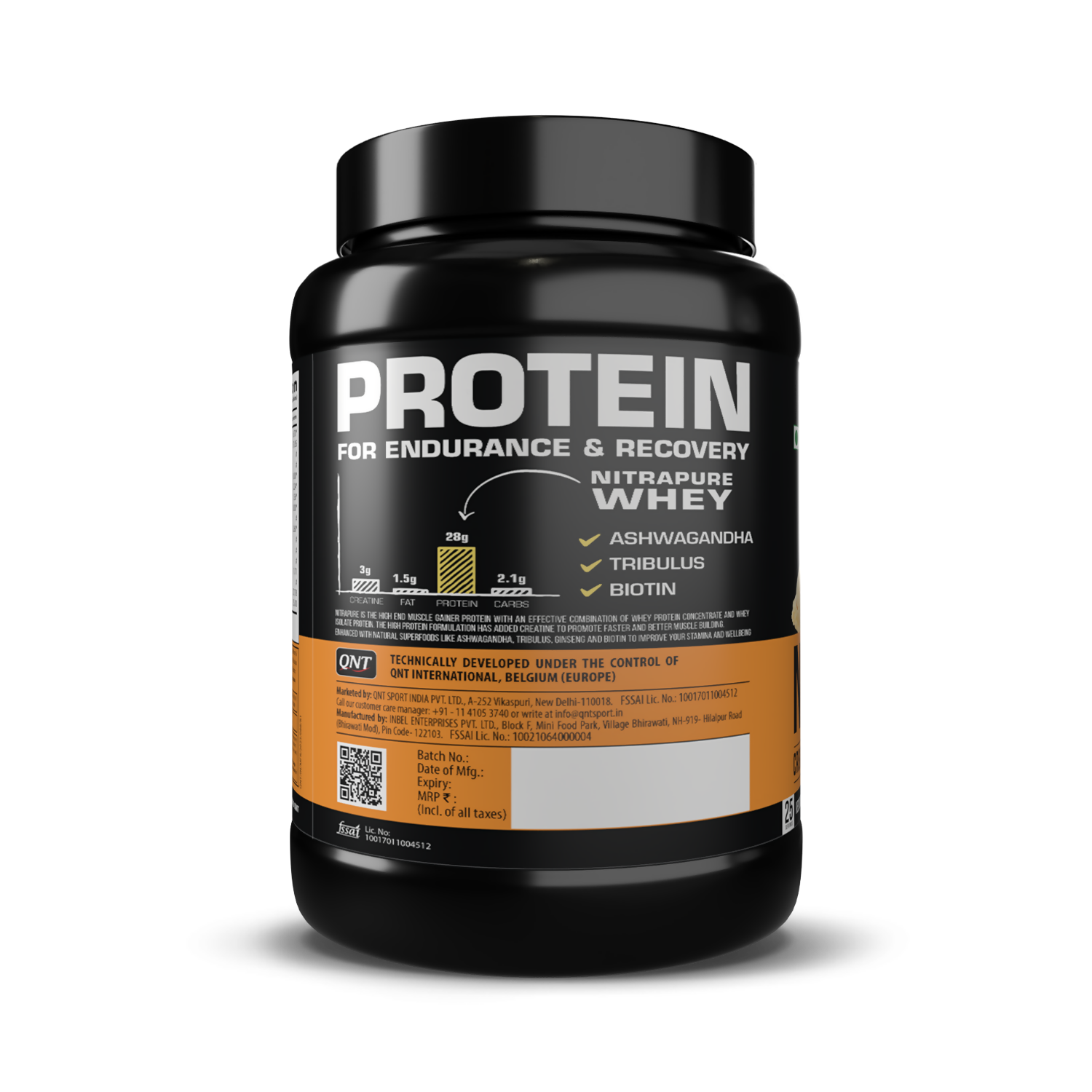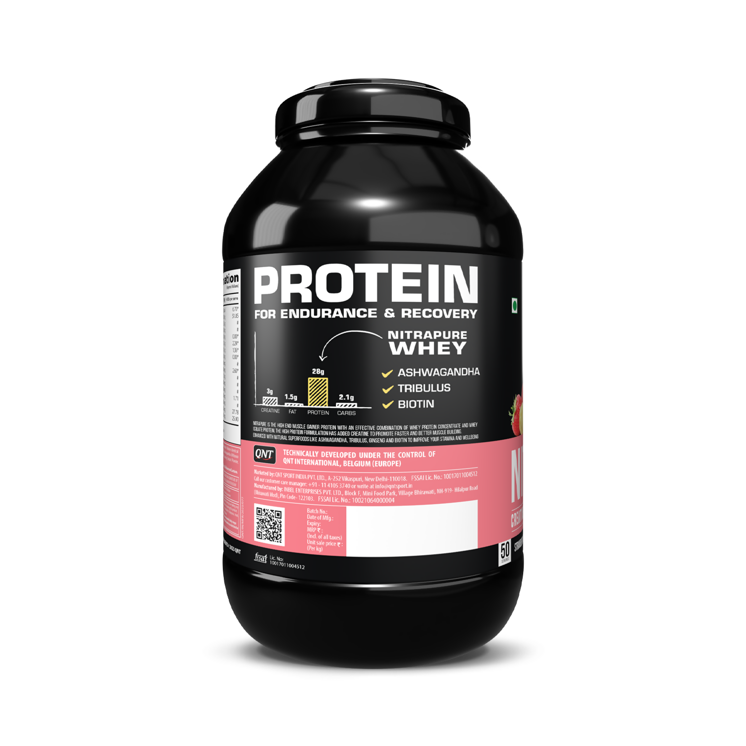 QNT Nitrapure, Blend of Whey Isolate & Concentrate | Enriched with Ashwagandha, Ginseng & Tribulus | Best Whey Protein for Muscle Gain | 28g Protein, 3g Creatine (per scoop)